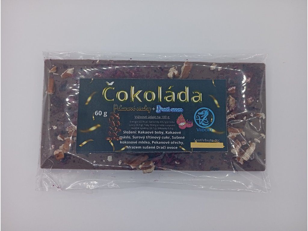 Složení: Kakaové boby, Kakaové máslo, Surový třtinový cukr, Sušené kokosové mléko, Pekanové ořechy, Lyofilizované dračí ovoce